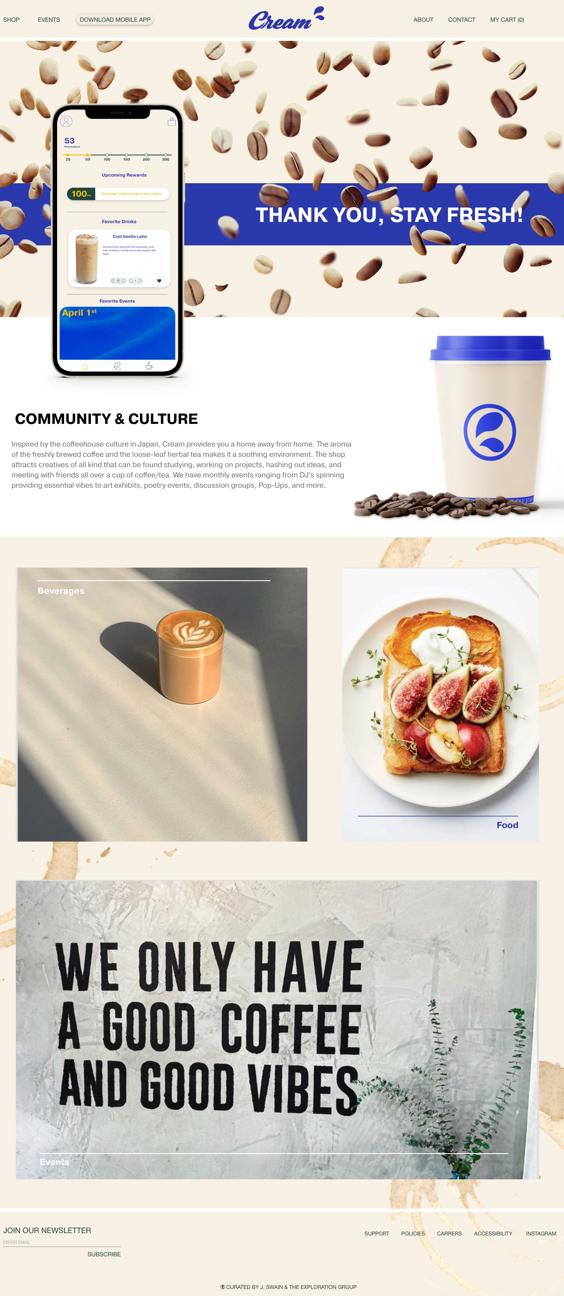I directed and designed a loyalty app for Cream Cafe. This coffeehouse draws inspiration from Japan's coffeehouse culture, aiming to provide a sleek yet cozy and aromatic environment where creativity thrives. The app includes features for event tracking, loyalty points management, and online ordering, all reflecting Cream’s unique branding. By aligning the design with the coffeehouse's atmosphere, I aimed to create a digital experience that enhances customer engagement, bringing the community-driven and creative spirit of Cream to life online.
